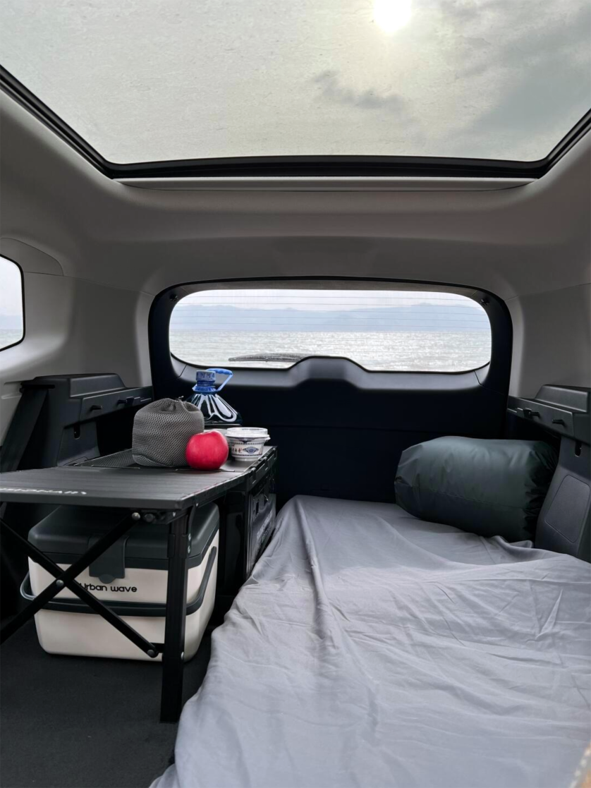 打开前备箱拉出小桌板,炒菜做饭; 吃好饭钻进座舱里,开启专属模式吹空调、看电视; 感觉到腹胀的时候抽出便携式马桶,在车里尽情“飞翔;” 太阳落山,拉出尾门里的淋雨棚在车尾冲个澡; 开启加热器在车里煮一壶咖啡,三个人挤在没有一张双人床大的狭小空间里美美的睡上一觉。这是在用车吗?